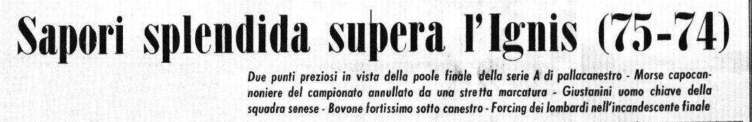 Splendida vittoria della Sapori Siena che è riuscita nell'impresa di battere i campioni dell' Ignis Varese. Grande primo tempo con una Mens Sana eccezionale in difesa e ben orchestrata all'attacco dove è riuscita spesso a mettere in seria difficoltà il solido baluardo difensivo dei campioni varesini.